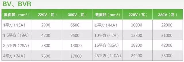 BV、BVR電線功率表