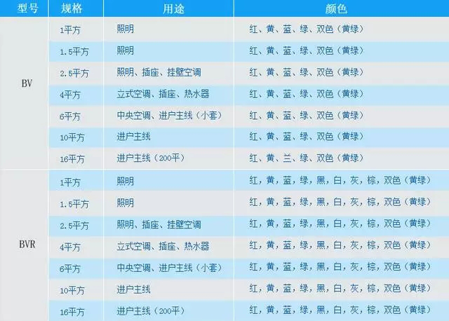 注:以上功率均為極限功率,根據(jù)使用環(huán)境不同會有誤差,數(shù)據(jù)僅供參考BVV、BV線的區(qū)別bvv電線全稱銅芯聚氯乙烯絕緣聚氯乙烯護套圓型護套線,又稱輕型聚氯乙烯護套電纜,俗稱硬護套線。 字母B表示布電線,字母V表示塑料中的聚氯乙烯。還有銅芯符號、硬線(常見的單芯導體)符號省略沒有表示。 結(jié)構規(guī)格:BVV與BV線的區(qū)別就是BVV比BV就多一層護套。適用于交流電壓450/750V及以下動力裝置、日用電器、儀表及電信設備用的電纜電線。線芯長期允許工作溫度不超過+65度。其標稱截面從0.75-10平方共分0.75;1.0;1.5;2.5;4;6;10七種規(guī)格。 用途:bvv硬護套線適用于交流電壓450/750V及以下動力裝置、日用電器、儀表及電信設備用的電纜電線,同時還用于明裝電線。如何辨別優(yōu)質(zhì)電線與劣質(zhì)電線