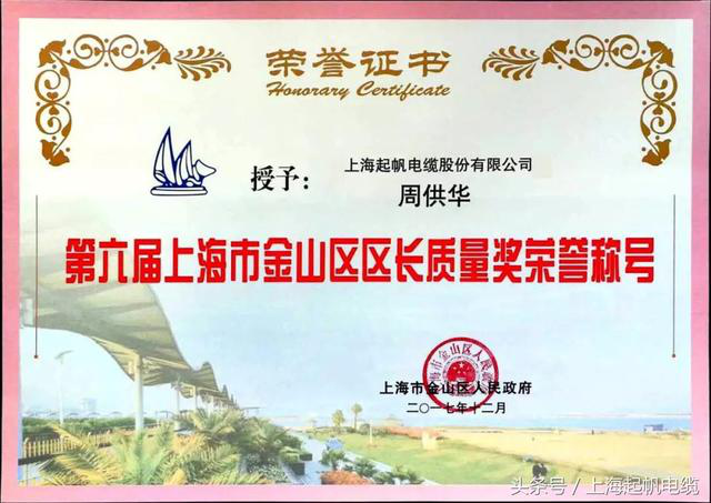 上海起帆電纜股份有限公司總經(jīng)理周供華作為獲獎(jiǎng)嘉賓出席頒獎(jiǎng)典禮,區(qū)長(zhǎng)胡衛(wèi)國為其頒發(fā)區(qū)長(zhǎng)質(zhì)量獎(jiǎng)。
